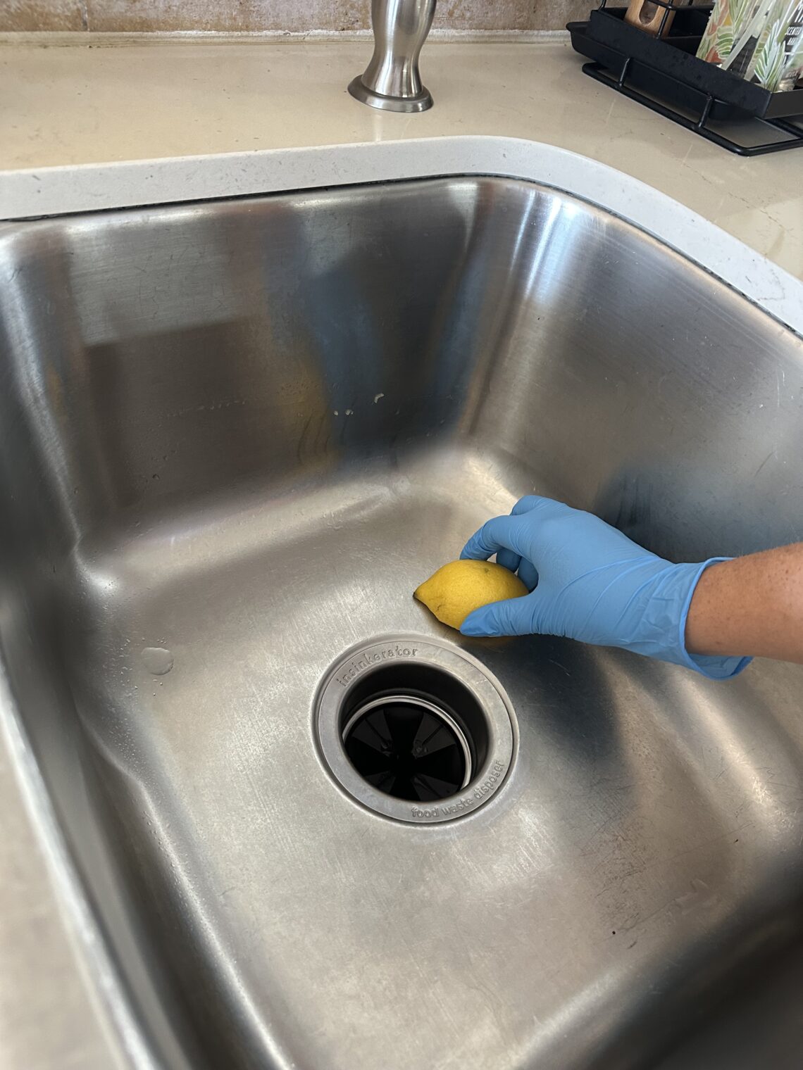 Remove all dishes, food debris, and sink accessories so you’re working with a clean space.